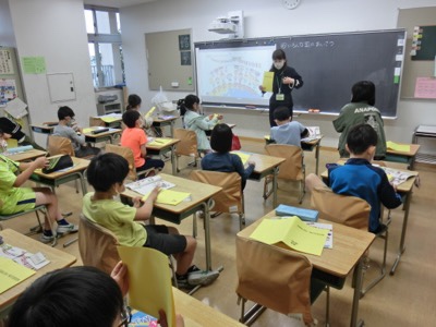 3-4の英語活動。岡部先生の授業です。黄色い紙は、これから使う「ENGLISH NOTEBOOK」の表紙です。