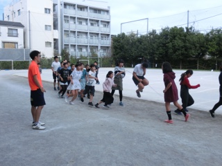 校庭が工事の期間、5・6年生は天沼中学校のグラウンドを借りて体育をしています。今日は6年生が天沼中で体育をしていました。青空の下、広々とした校庭で直線50mを走るのは気持ちよさそうです。