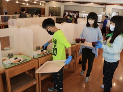 朝会のあとは朝ごはんです。食事係がお味噌汁など簡単な配膳をします。 今朝のメニュ...