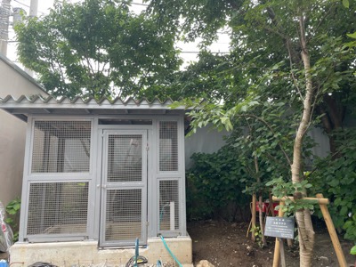 外の飼育小屋もサイズダウンして新しくなりました。卒業記念樹の桜2本もここに移植しました。