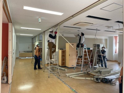 16日土曜日の午後から、3-3・3-4の教室を図書館に改装する工事が始まっています。夏休み中に完成させるために、1日でも早く工事を始める必要があり、終業式を16日としました。既に、廊下側の壁がなくなりました。