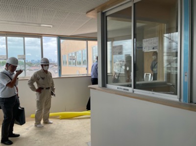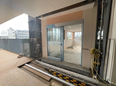 まだ工事中ですが、中を少しだけご覧ください。本校舎側のベランダからの渡り廊下入口です。