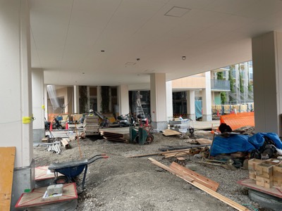 増築校舎の1F部分はピロティ構造になっています。雨の日でも遊べそうです。これからまだ校庭や校門の改修が続きます。