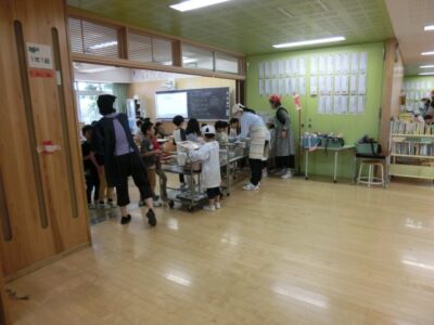 1年生のはじめは、安全に給食準備ができるようにとついてくれています。5月中旬まで続きます。ありがとうございます。