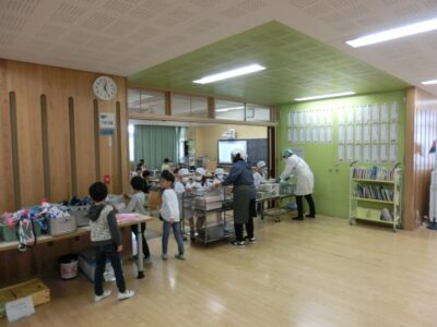 今日の1年生の給食準備の様子です。担任の先生以外に大人が2人。栄養士さんとAW(学校支援本部)さんです。