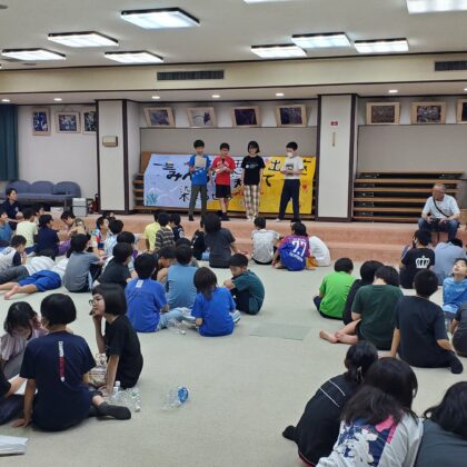 昨晩は雨のため、夕食後の活動を室内レクに変更しました。レク係を中心に、曲名当てク...