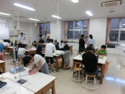 実験器具に、砂、れき、どろを流し込んでいくと写真のように層が出来上がり、子どもたちも納得。砂などの粒の重さと積もり方に関係があること気付きました。あっという間の2時間でした。