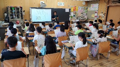 2年生の教室をのぞくと、ペンギンが誤ってボールペンを飲み込んでしまう段落を学習し