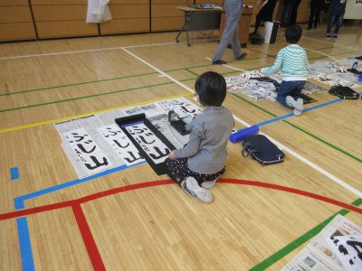 地域の書家の方をゲストティーチャーにお招きし、年明けの書初めに向けてアリーナで書...
