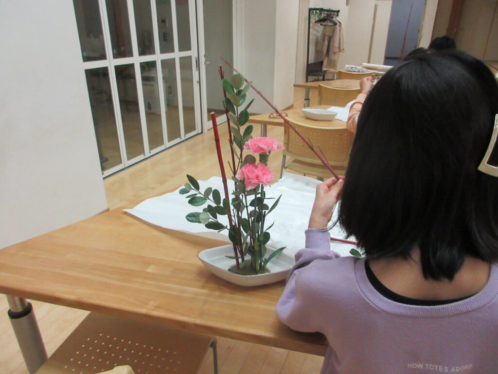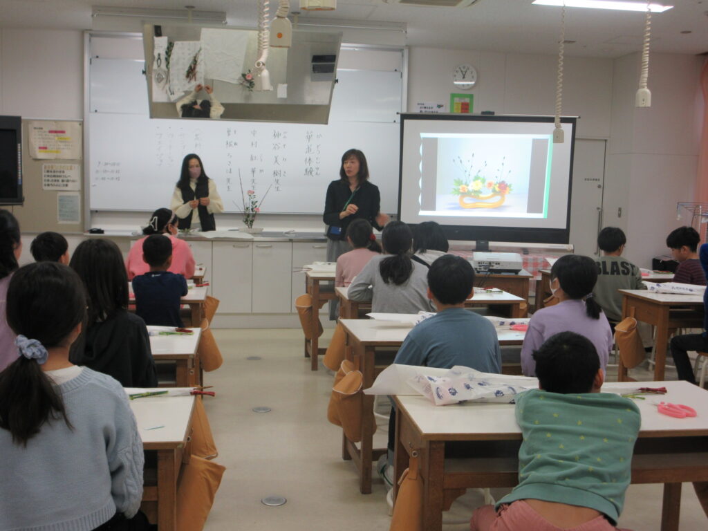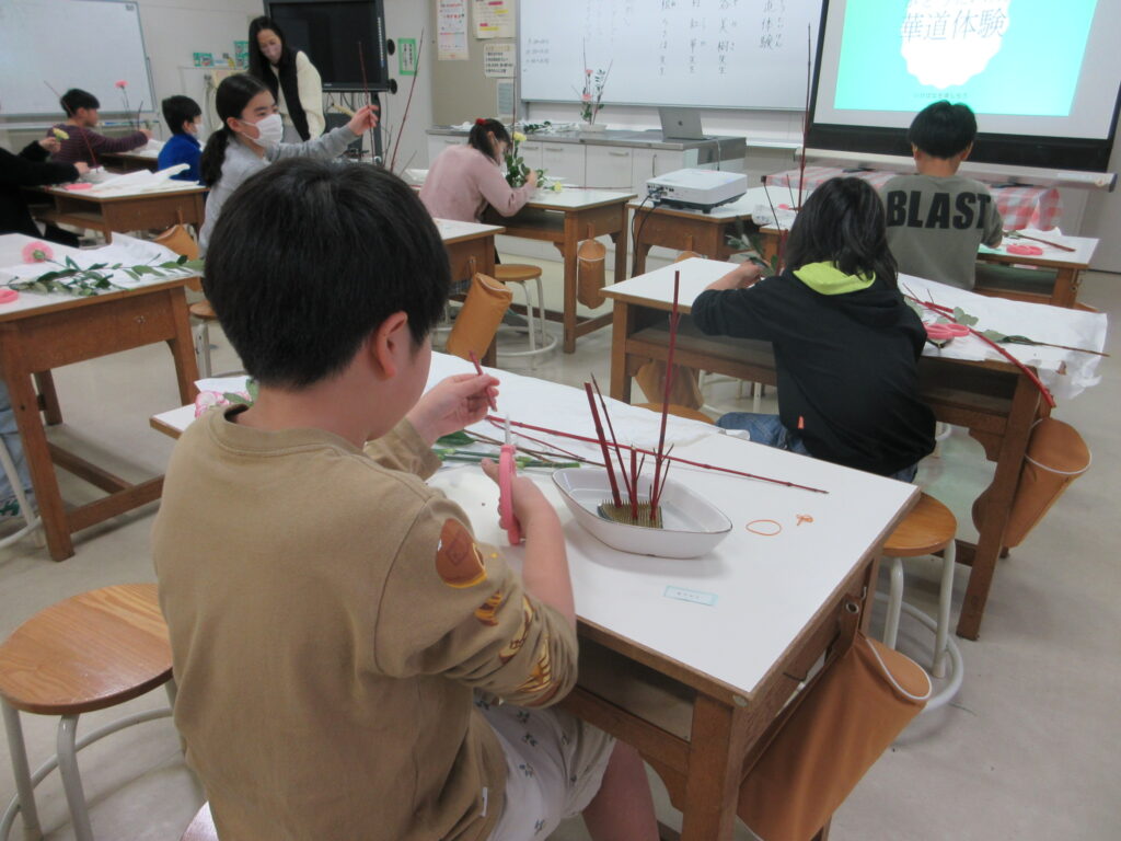 今日は4年生で華道体験がありました。前半は華道についてのお話を伺い、後半は一人一人に分かれて実際にいけていきます。