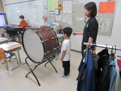 こだま学級の前を通ると、子どもたちが大太鼓・小太鼓・手拍子でリズム打ちを楽しんで