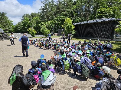 山梨県にある富士山世界遺産センターに来ています。ガイドの方の説明や登山道の映像、大きな富士山の模型などを班ごとに見たり聞いたりしてきました。