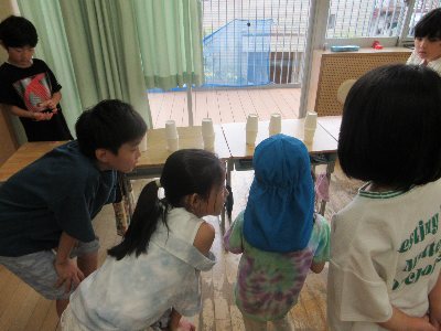 明日にせまった天沼まつりのプレ活動として、幼児の皆さんをお迎えし楽しんでいただきました。写真は、割りばし鉄砲で射的をしている様子です。子どもたちの笑顔がたくさん見られました。