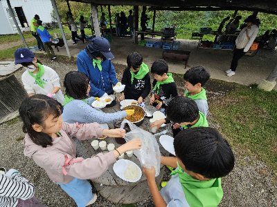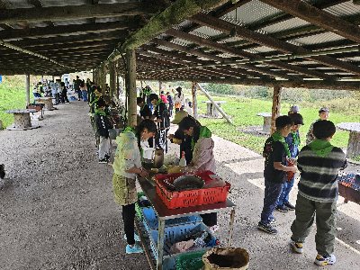 予定通り、鷹山ファミリー牧場に到着しました。これから飯盒炊さんに挑戦です。初めに全体で話があり、その後、班長、調理、炊飯、かまどなどの係に分かれて説明を聞きました。
