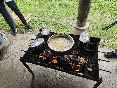 かまどに薪を組む人、野菜を切る人など、役割を分担して進めていきます。