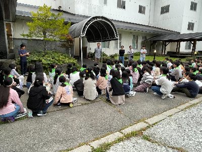 似たような写真が続きますが、部屋に荷物を置き、早速避難訓練を行いました。速やかに宿舎玄関前に避難することができました。この後は入浴です。