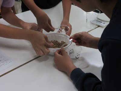 写真は、豆を魚に見立てたゲームに取り組んでいるところです。ゲームを通して、魚をとる量はどのように決められているのか?など、漁業のルールについて考えていきました。
