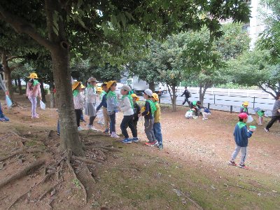 ドングリ拾いをしたり虫探しをしたりして、子どもたちはとても楽しそうでした。公園への行き帰りの様子を見ると、1年生と2年生の距離も縮まって仲良くなれたようです。