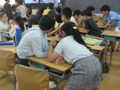 4年生の教室をのぞくと、子どもたち同士で腕相撲で対戦し盛り上がっていました。隣で