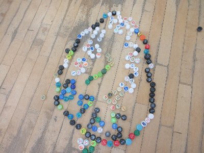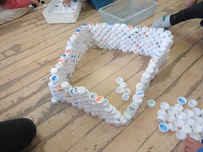 1年生の子たちが教室で楽しく活動しています。身のまわりの物を並べて色々な形を作っています。今日はペットボトルキャップを使って挑戦です。