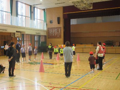 アリーナでこだま学級のみんながボールゲームに取り組んでいました。チーム同士で向き