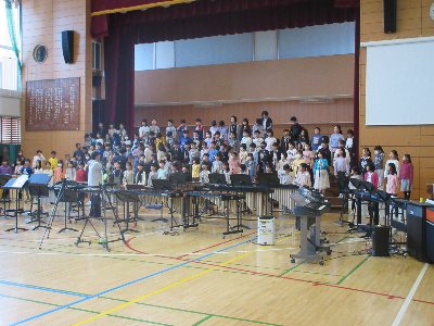 1年生は、タンバリンやトライアングル、鍵盤ハーモニカ、木琴、キーボードなどに分かれて並び練習していました。繰り返し演奏する部分の確認などを行いながら、全体での演奏スタート! 初めての音楽会に向けてみんな一生懸命です。