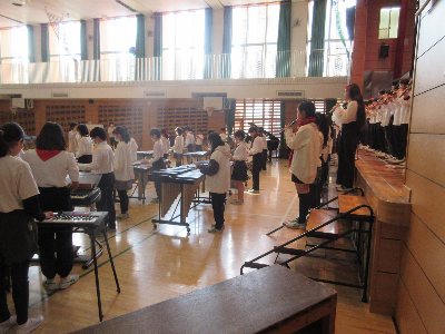 今日は音楽会へ向けてリハーサルを行いました。本番と同じ順番で演奏していくので、6年生は最後に登場です。自席の入場から始まりました。