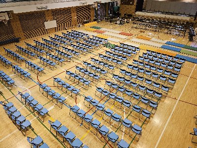 会場は写真のように前からマット席、椅子席となっています。明日の保護者鑑賞日では、「入場券、上履き、外靴を入れる袋」を忘れずにお持ちください。来賓、保護者の皆様、お待ちしています。