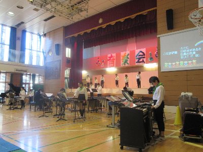 子どもたちの元気な歌声が響きます。合奏では、大太鼓や小太鼓、木琴、キーボードなどを使ってリズムよく演奏できました。ハンドベルの演奏もとっても素敵でした。