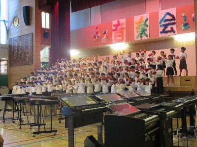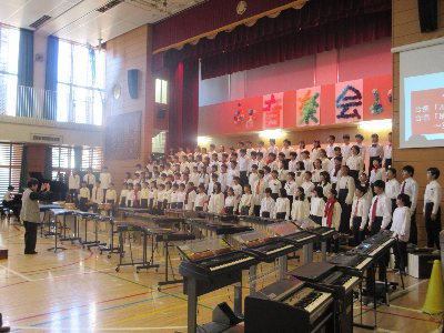 子どもたちのノリノリの曲紹介からスタート ! 歌声はもちろん素敵でしたが、合唱と合奏の間の衣装替えにびっくり。マラカスやタンバリンなどのパーカッションと、リコーダー、鉄琴等の音がきれいに重なりました。
