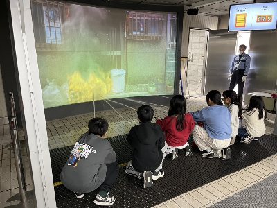 防災館では、グループごとに消火器や起震車などの体験をしました。「火事だー。」と大きな声を出して周りに助けを求めるとともに、消火器の使い方を覚えて消火活動に挑戦できました。