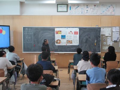 外国籍のお子さんが天小に転入し、日本語指導の時間に学習したことをクラスのみんなに発表しました。指導担当の先生と、日本語や英語、母国語を使い調べてまとめたそうです。調べた内容は、お祭りや食べ物についてです。(写真は担任が取組の説明をしているところです。)