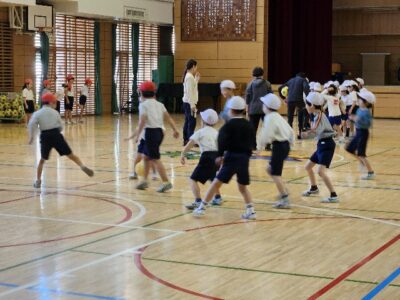 後半は、ボールを足で操作するゲームに集団で取り組みました。あっという間に45分が過ぎてしまったようです。夢中になって運動遊びに取り組む姿が見られました。