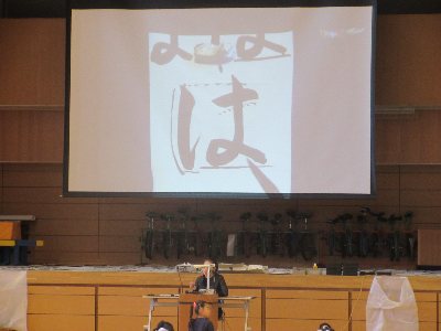 その後アリーナをのぞくと、3年生が書初めを練習していました。書家の先生が書く様子を大きなスクリーンに映し、筆の置き方・運び方などを一つ一つ丁寧にご指導いただきました。年末に続き2回目の取組です。