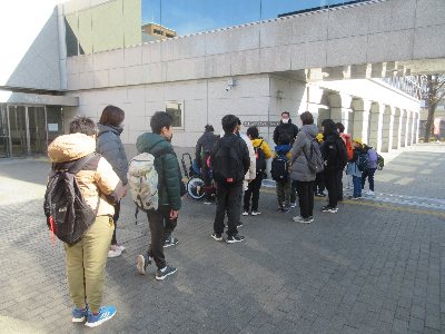 子どもたちは他校の作品などを興味深く鑑賞して、自分の気に入った作品を私に教えてくれました。他の学校の友達と交流する姿も見られました。写真は帰校時の様子です。