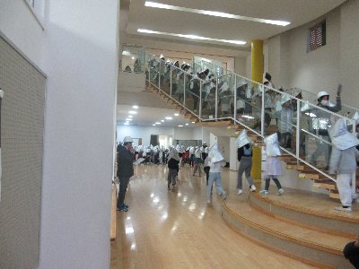 2025-01-24 (学校)避難訓練 今日は今年度9回目の避難訓練を行いました。想定は、Jアラートなどによる屋外に危険がある場合です。サイレンがなると、校庭で体育をしていたこだま学級の子達もしゃがんで避難しました。 その後、地下1階のスペースに全校が移動して避難しました。いつも通り、約6分ほどで避難完了。 避難の際には、窓に近づかないことや頭など大事なところをかくしてしゃがみ避難することを、全員で確認しました。 Home › 学校全体 › (学校)避難訓練 関連記事 全校朝会 夏休みの自由研究 最後の全校練習 横並びの百人一首 体力調査2日目 (学校)学校保健委員会 (AKA)3校合同教員研修