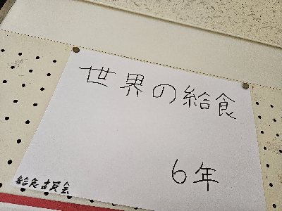 朝、昇降口へ行くと子どもたちが集まっていました。行ってみると給食委員会の子どもたちが作った「世界の給食」の掲示物を発見 !