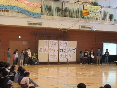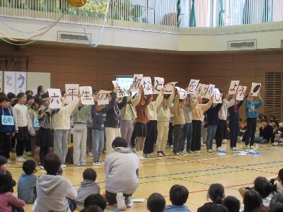 代表委員によるはじめの言葉の後は、こだま学級によるスローガン発表です。今年のスローガンは、「まんかいのえみでつたえよう」です。写真では分からないですが、一文字一文字を和紙のちぎり絵で作ってくれました。
