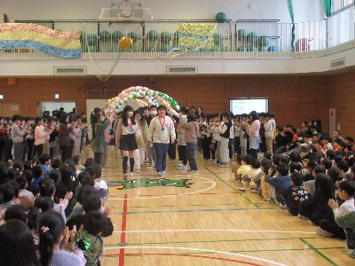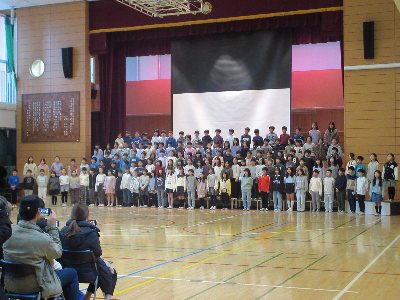 会の後半は、1年生の出し物です。これから未来へと進む6年生にエールを送る替え歌を...