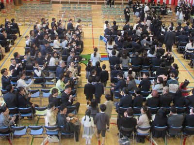 4月7日、満開の桜の中入学式を無事終えることができました。今年度の新1年生は、113名。写真は、子どもたちが会場に入場している様子です。