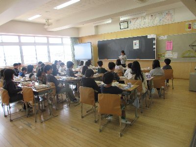 2から5年生は、昨日8日から給食が始まりました。今日9日のメニューは、わかめごは