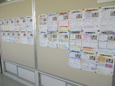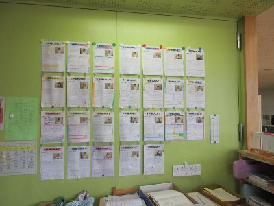 3年生の教室の前を通ると、カラフルなめあてカードが並んでいます。のぞいてみると、学習や生活に関する子どもたち一人一人が考えた1学期のめあてが書かれています。