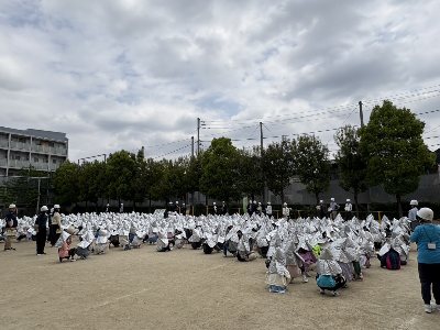 1年生は避難訓練で、オープンスペースにて防災頭巾をかぶったり集合する練習を行いました。この後、引き取りについてのアンケートを送付いたします。ご協力いただけますようい願いいたします。