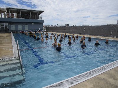 先週から水泳の学習が始まっています。写真は5年生の様子です。入水時のきまりを確認して、準備運動やシャワーの後、バディを済ませ入水です。