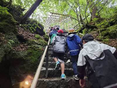 昼食の後は、富岳風穴に来ています。中に入るとひんやりして、とても涼しいです。天然の冷蔵庫のような所で、中の気温は年間を通して3度ほどだそうです。