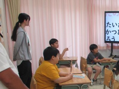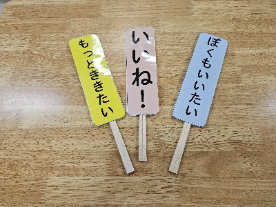 聞く側は、「いいね!」や「もっとききたい」などの札を挙げて話を続けていくという流れです。理由を聞いたり、好きなものを具体的に聞く姿も見られました。和やかに学習に取り組んでいました。