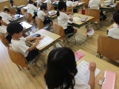 2学期2日目、校内に元気な子どもたちが戻ってきました。早速、算数の学習が始まっていました。一方で、1・3年生はめあてカードを記入していました。