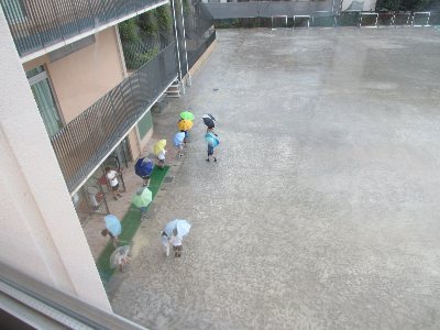 今日は雨降りの1日でした。校内を回っていると、4年生が校庭に出て水たまりの様子を...