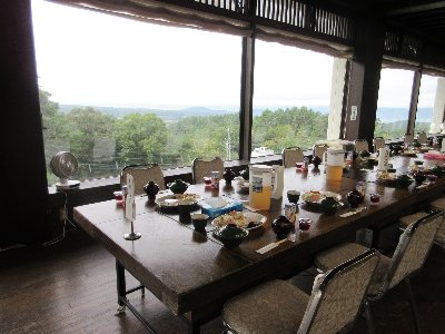 写真は朝食会場から見える外の景色です。曇り空ですが、思ったほどの寒さではありません。今日はこれからスコアオリエンテーリングへ出かけます。