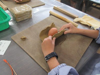 土鈴体験では、粘土をのばして包み込むように作っていきます。鈴を入れて包み込んだ後は、模様を付けていきます。